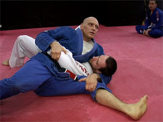 Class was a trip today. I think my body's still a little miffed over being invaded by needles, so I took it easy. We started out doing defenses against omoplatas...Wooooo! The second one involved a lot of chest pressure....Booooo! My breasts can normally take a good amount of abuse, (which is part of the sport..heads up to any ladies out there reading this and considering taking up the art. Be ready for it). Today though, I was scared and hesitant. The idea of side control, top or bottom, had me itchy. That defense? There was no way. I just couldn't maintain proper pressure while spinning on my inside knee. I wasn't in pain or anything, but my mind wouldn't let me go there yet.
